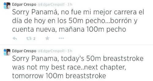 «Sorry Panamá, no fue mi mejor carrera el día de hoy en los 50m pecho; borrón y cuenta nueva, mañana 100m pecho», fue lo que escribió Crespo, esta mañana, en su cuenta de Twitter @EdgarCrespo11.