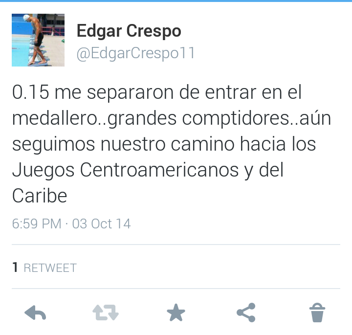 El nadador Edgar Crespo, una de las esperanzas panameñas para ganar medalla en los XXII Juegos Centroamericanos y del Caribe, de Veracruz, México, señaló que ya está bajando las cargas de los entrenamientos y que se siente en óptimas condiciones para la competencia.